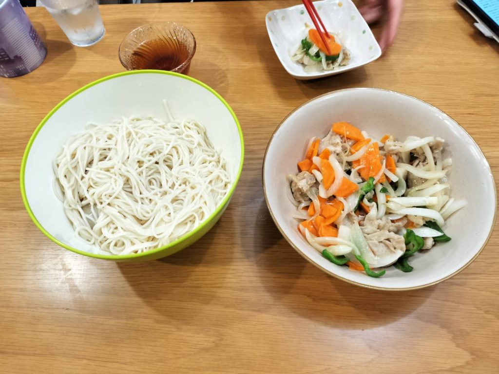 試しに炒め物を作り、主食に冷や麦と麺つゆを添えてみた。