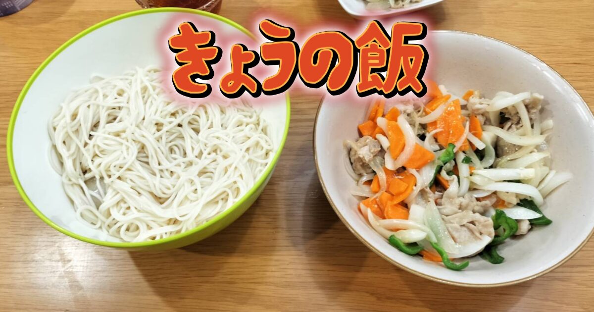 試しに炒め物を作り、主食に冷や麦と麺つゆを添えてみた。