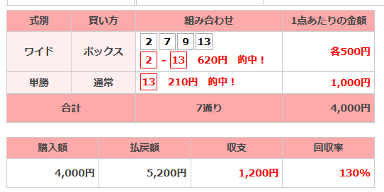 筆者は2,5,9,13のワイドボックスで買い目を入れていたが、