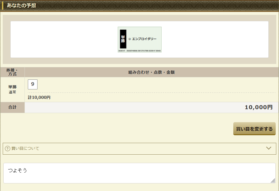 ちょうど明日、G1レースがあるようなのでとりあえず一番人気の馬に単勝で入れてみた。